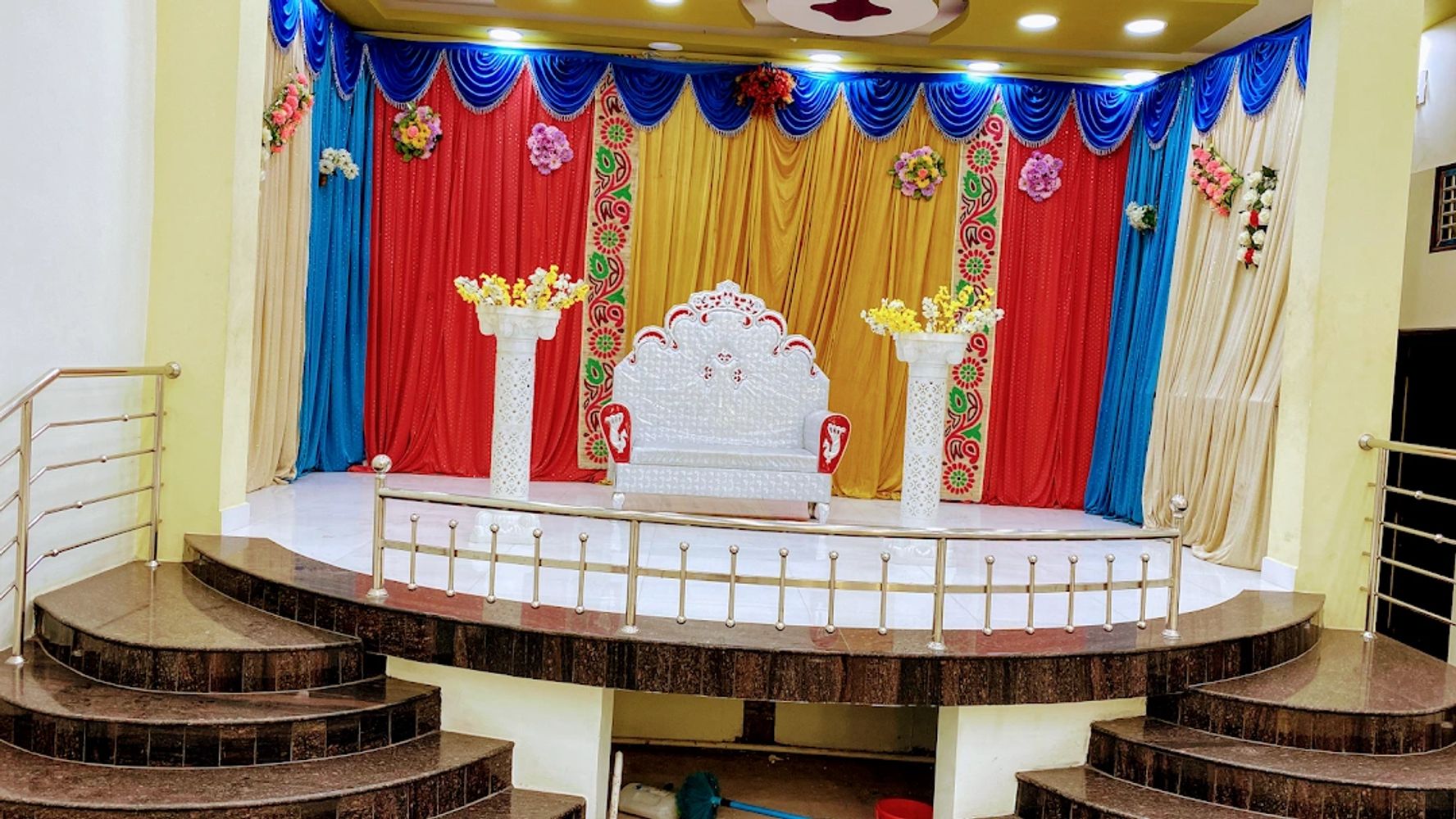 Vijaya Chandra Mahal is an elegant, centrally air-conditioned and newly constructed Mahal in Ambai Taluk in Tirunelveli District with 500 seating capacity, Kitchen and Dining attached. It has outstanding features and excellent amenities. The Mahal is located in Vickramasingapuram near Dr.Chandrasekaran hospital Campus. It is Aesthetically Designed and well suited for Wedding, Family, Corporate and Commercial Functions and Events.
